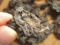 手作業でしっかりと「揉捻」された茶葉で、しかも30年以上の老茶となると、茶葉は開きにくく、まる一日水に漬け、ゆっくり茶葉の開くのを待ちました。赤く変色した茶葉、カサカサした質感、ザラザラして、古茶樹の特徴があります。またところどころイボイボのある表面は茶商の倉庫熟成で、金花などのお茶を美味しくする菌類の活動がわずかながらにもあった跡です。