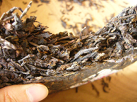 この早期の「7582青餅」には、陳年茶葉が80%も配合されていると言われています。餅茶の裏も表も、美しく仕上げるための細かい茶葉が配置されていますが、割ってみると、中にはたしかに大きめの粗い茶葉が多く見つけられます。