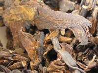 乾いた木の皮のように見える大きめの粗い茶葉。