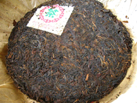 上記のように、古くなった大きめの粗い散茶を混ぜて固めて圧延して餅茶にしていますが、古い散茶と新しい茶葉の配合が均一にはならないので、一枚一枚に差がでます。それで、中には特別大きな茶葉が目立つ餅茶が存在しました。「大葉青餅」と名付けるのにふさわしい餅茶です。