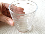 この写真の耐熱グラスは、水を8分めに入れて150ml入る、ごく普通の大きさのものです。