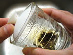 蓋をして、少しずらして、グラスを傾けて湯を捨てます。ゆっくり少しずつ湯を流すと、茶葉は流れません。