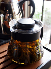 西双版納の古茶樹の大きな葉は、じわっと抽出するのが美味しいです。たっぷり湯の入る少し大きめのポットを合わせてみましょう。紅茶専用のものよりも、コーヒー用のが機能的かつ安価で使いやすいと思います。